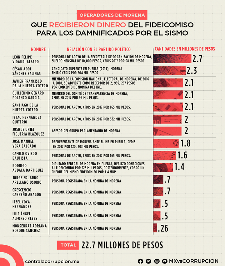Los depósitos “hormiga” eran al fideicomiso “Por los demás”, que Morena creó para los damnificados, aunque una investigación del Instituto Nacional Electoral (INE) –de la cual se dio vista a la entonces Procuraduría General de la República- identificó que una porción del dinero fue sacado para ser repartido a operadores de Morena, quienes supuestamente entregarían la ayuda personalmente a los afectados por el sismo.