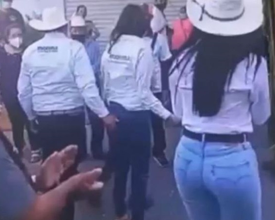 En el video se puede ver cómo el hombre se detiene durante la caminata, para dirigirse hacia su izquierda, toca a la mujer en el brazo y posteriormente toca su glúteo, lo que provoca que ésta reaccione llevándose las manos hacia la zona.