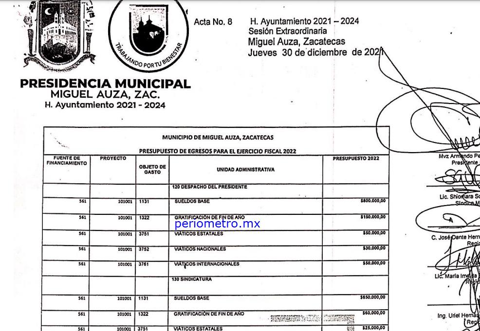 Zacatecas, Zac.- Un acta de Cabildo con fecha del 30 de diciembre del 2021 hace constar que el cabildo de Miguel Auza se aprobó el sueldo un 30 por ciento para 2022.