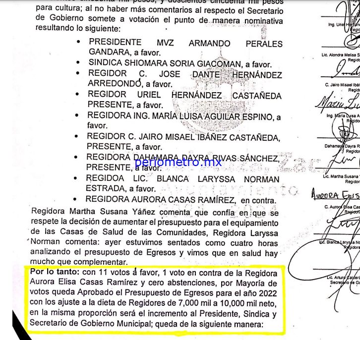 Así, el «ajuste» que según la propia acta de Cabildo, advierte que el aumento también es proporcional en beneficio del alcalde, la Síndico y el Secretario de Gobierno, otorga salarios de la siguiente forma: