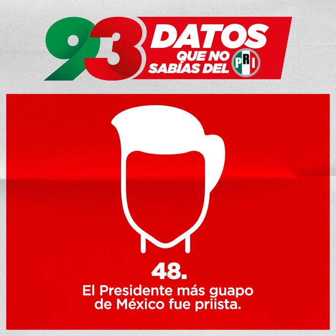 “El Presidente más guapo de México es priista”, así se titula el dato número 48, acompañado de la silueta de un hombre con un aparente “copete”, haciendo referencia al peinado que utilizaba el expresidente de México y también priista Enrique Peña Nieto (2012-2018).