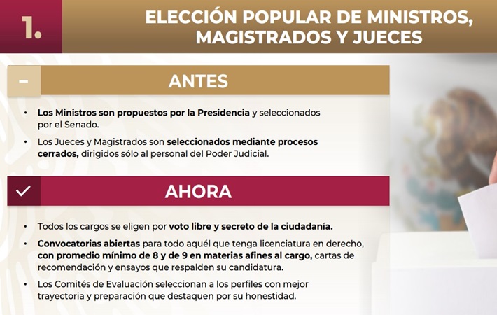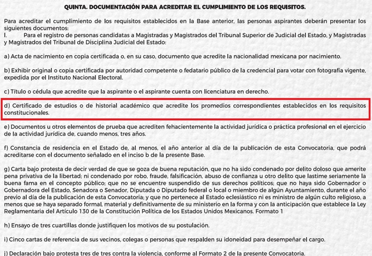 La convocatoria para elegir a jueces, magistrados y ministros publicada el lunes 4 de noviembre, en el Diario Oficial de la Federación (DOF), de los requisitos que deben cumplir las personas interesadas en presentarse para alguno de los cargos, dejaba en claro los mismos. Desde un promedio mínimo de 8 en la carrera de derecho, hasta escribir un ensayo de tres cuartillas para justificar la candidatura y contar con cartas de recomendación de vecinos, eran parte de los elementos a cumplir para considerarse idóneo.