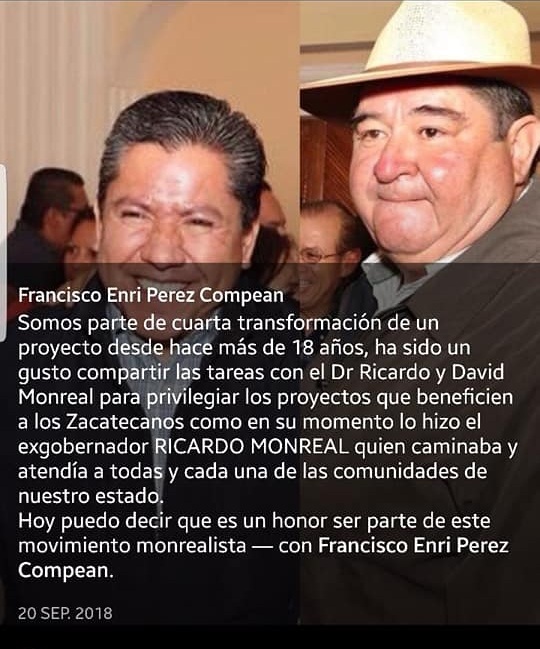 Pérez Compeán pertenece, al igual que la diputada Villalpando -su esposa-, forman parte del grupo político que encabeza la senadora Verónica Díaz y el propio David Monreal. En enero del 2019, la entonces delegada de Programas para el Desarrollo en Zacatecas, Verónica Díaz Robles y Luis Jiménez Guzmán, director general de Conciliación, Arbitraje y Servicios Periciales de la Procuraduría Agraria, le rindieron protesta a Francisco Enrique Pérez Compeán, como nuevo titular de la oficina de representación de la Procuraduría Agraria en la entidad. Pérez desde el 2018, había manifestado de manera muy abierta «ser «monrealista» en su perfil de Facebook, a pesar de haber trabajado en el Gobierno del Estado en el sexenio de Miguel Alonso.