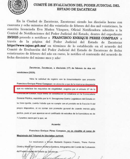 El 26 de febrero del año en curso, el Comité Evaluador del Poder Judicial notificó a Pérez Compeán como no elegible por no contar con el mínimo en promedio -pues cuenta con 7.2-, aún así, la injerencia política se movió entre las fibras del Comité Evaluador conformado por Yrene Ramos Dávila, María del Carmen Arellano Cardona y Abelardo Esparza Frausto.