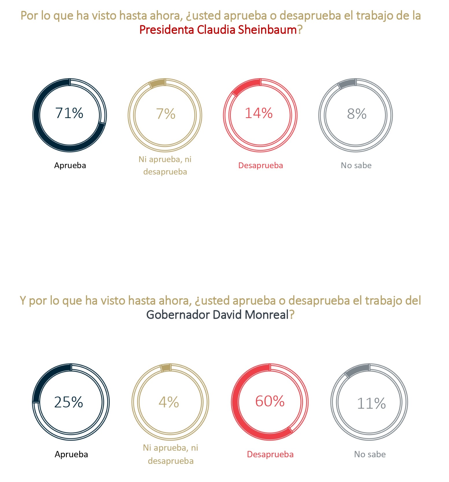 Ahora bien, la presidenta Sheinbaum tiene gran aprobación en Zacatecas, pese a los tibios intentos de deslegitimarla. De las Heras, una de las casas encuestadoras de mayor prestigio en el país, en su demoscopía de febrero, indica que la mandataria tiene un 71 por ciento de aceptación, contrastando de manera enorme con David, que alcanza apenas 25 puntos a favor pero con un escandaloso rechazo de 60 por ciento.