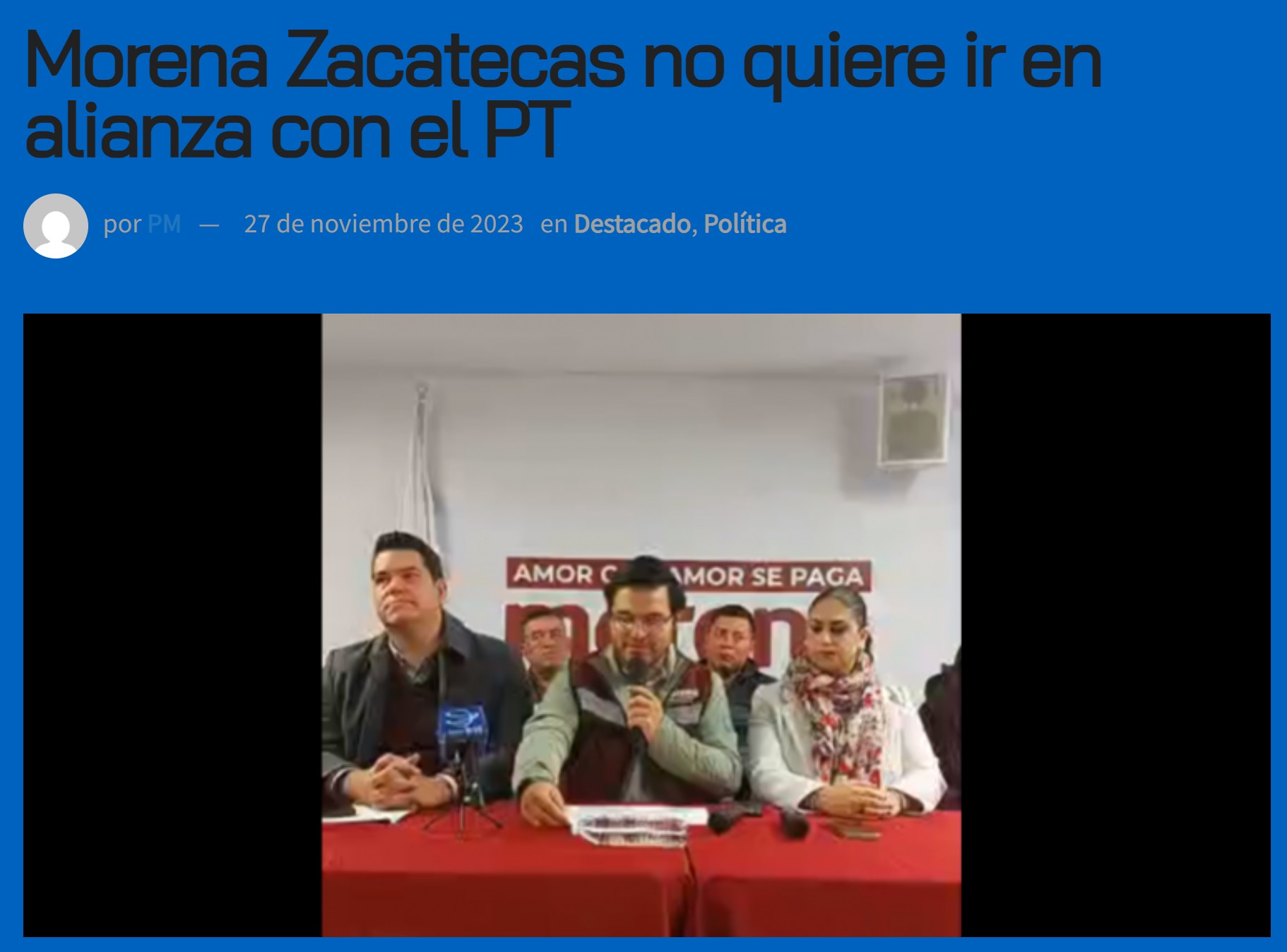 Morena estableció que tampoco se podrá proponer a candidat@ en coalición, es decir, en aquellos lugares en los que Morena vaya en alianza con Verde y PT, o solamente con alguno de éstos, también se impide su postulación; sin embargo, el antecedente que enmarcó el partido del Tucán para permitir que en San Luis Potosí, se heredase la posibilidad de que la esposa del actual gobernador lo suceda, desliza una posibilidad que se extendería en otras demarcaciones, como podría ser el caso Zacatecas.