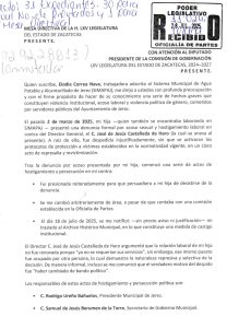 Además, señaló directamente al alcalde de Jerez, Rodrigo Ureño Bañuelos, y al secretario del gobierno municipal, Samuel de Jesús Berumen, acusándolos de presuntamente proteger al funcionario denunciado y de presionar para que su hija retire la denuncia.